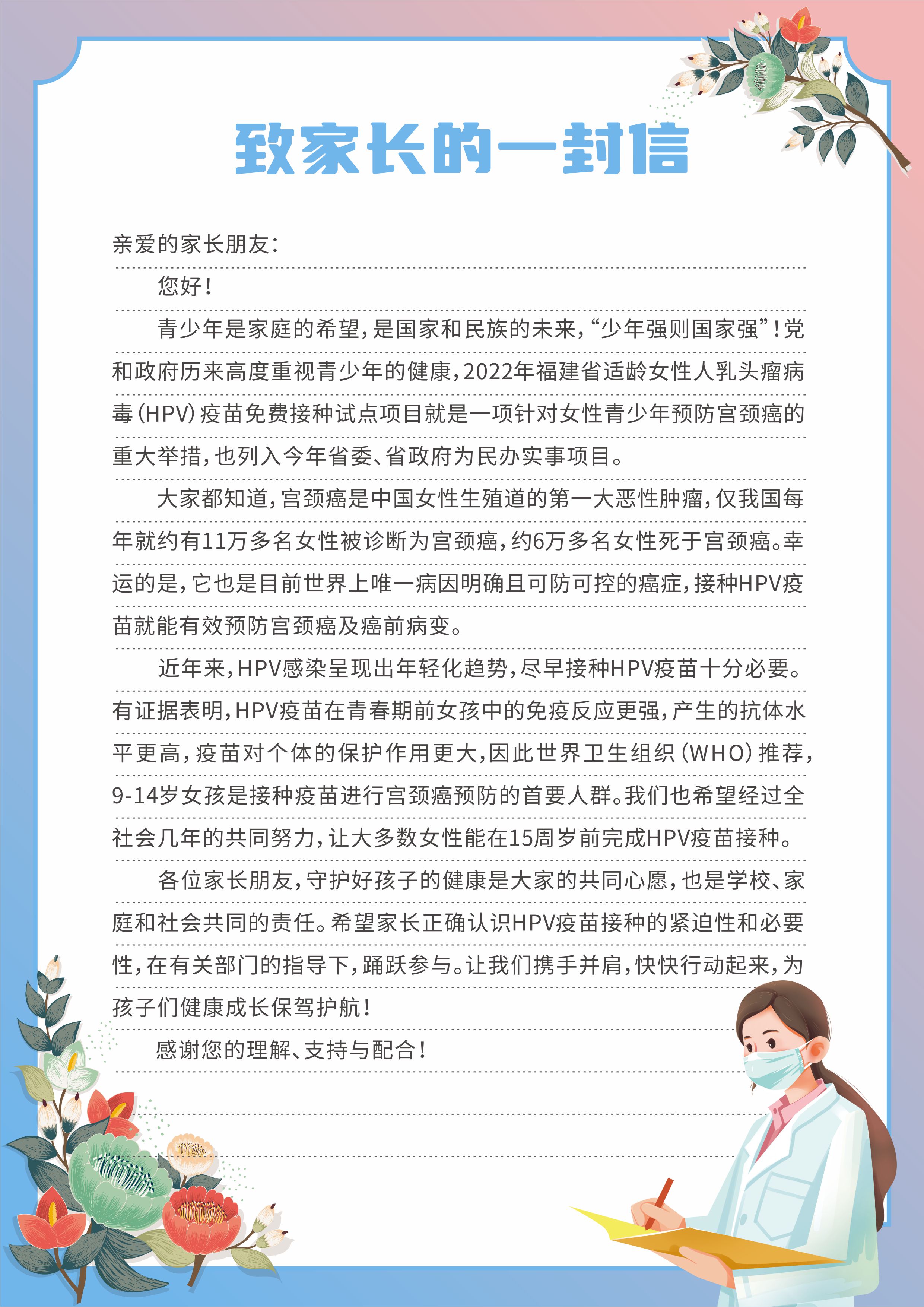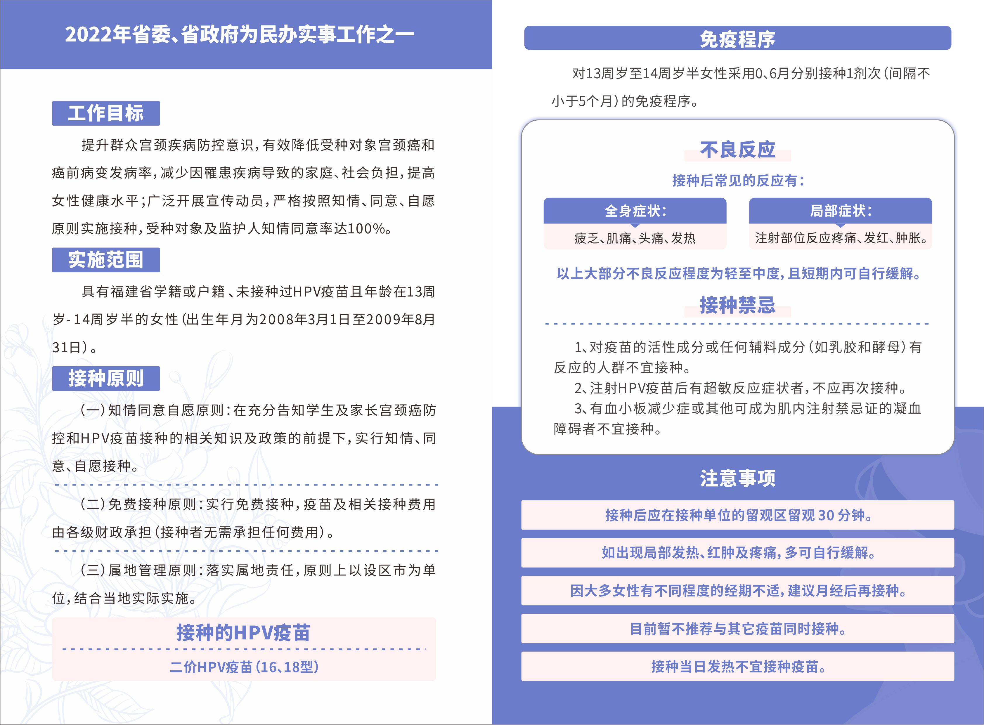 供福建省各地开展适龄女性人乳头瘤病毒(HPV)疫苗免费接种项目宣传使用。